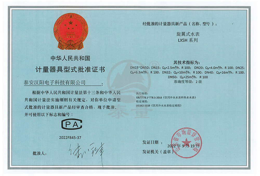 旋翼式水表型評證書